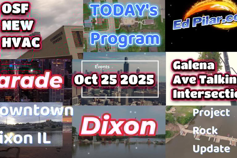 See Dawn, Downtown, The Project Rock (Page Park Rock River Bridge) Update, Galena Ave's New Talking crosswalk, Oliver's End of the Cookouts, OSF St. Katherine's New HVAC system installation and the entire Halloween Parade. All Filmed by Ed Pilar in HD on Oct 25 2025.