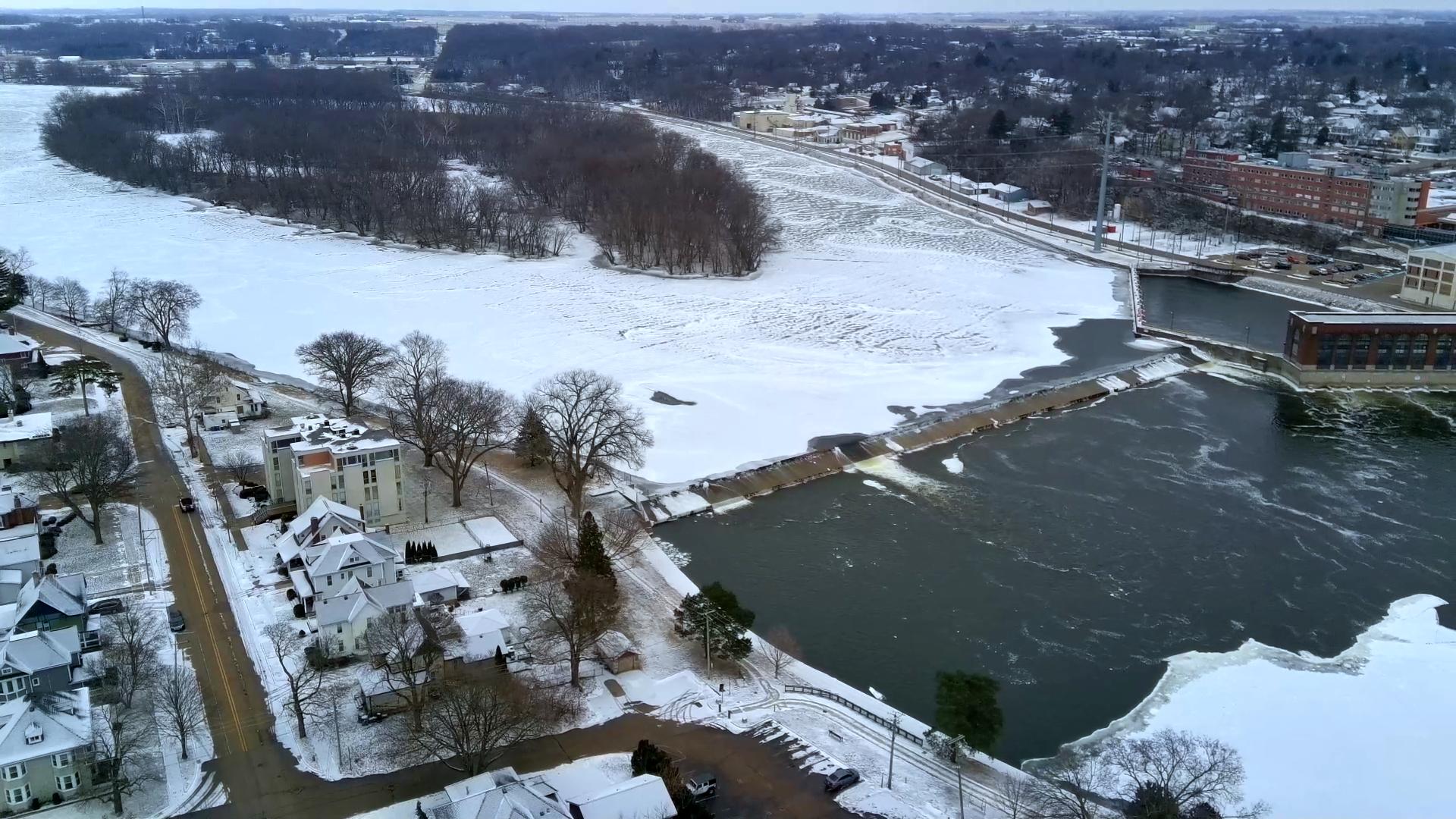 The Rock River and the Dam. Plus progress of project Rock and downtown Dixon from the sky.